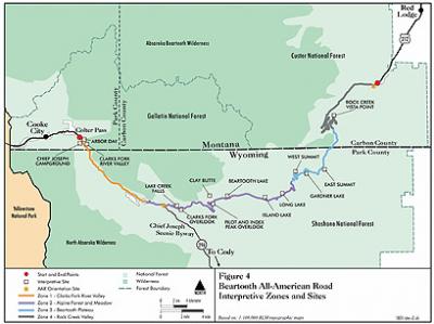 The road travels from Yellowstone National Park to the Montana town of Red Lodge with the mid-section of it falling on the Wyoming side of the border. Traveling east, the first 8.4 miles lie within Montana, passing through the communities of Silver Gate and Cooke City and over the Colter Pass (elevation: 8,200 feet). The next 34.7 miles fall within Wyoming and climb from the Yellowstone River’s Clark Fork over the Beartooth Plateau to the Western Summit at 10,947 feet above sea level. The last 23.7 miles of the highway are in Montana. At the end, you descend from the Beartooth Plateau into the Rock Creek Valley and Red Lodge.
