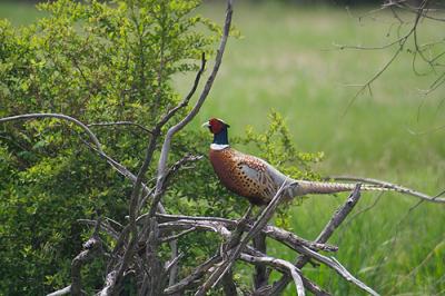 Introduced to the mass of Montana wildlife in the early 20th century, pheasants are often found in areas where native prairie and cropland intermingle. The males are unmistakable, gaudy even, with their scarlet face patch, white collar, and complex iridescent plumage. Females are a much more subdued, mottled brown pattern. Pheasants, which can weigh upwards of three pounds, will resist flying if possible. They are large animals whose food base of insects, grain seed and berries is almost entirely terrestrial. While a poor flyer, a pheasant is a fantastic runner. If a predator is spotted at a distance (such as your car rapidly approaching), the bird will often scuttle away at an impressive rate of speed. Unfortunately, many pheasants unwillingly end up as hood ornaments because of this tactic!