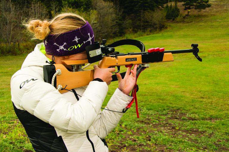 To maintain the fitness for skiing and precision for shooting, athletes train in a combined program, working the combination of target shooting and ski racing. However, they don’t always do both in the same session. “It comes down to learning how to do it correctly without a cardiac load,” says Sheppard. “The more you do it, the more it becomes second nature. Imagine running up 15 flights of stairs, then trying to thread a needle.” Each athlete will find a place they shoot the best; it just takes many, many repetitions.