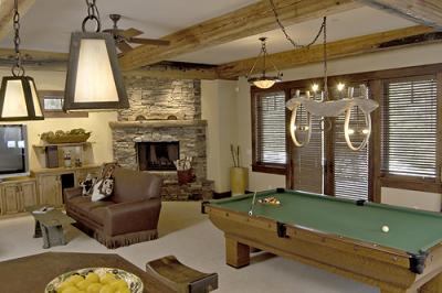 “This is what I’d call the typical Montana lodge,” says Seelye. Our tour began with the vast garage. Following Seelye around feels like an interminable architectural enthrallment. The first steps inside the house promise a classic western, rustic but elegant style. Meandering inside this posh-but-cozy log home instead reveals a mysterious European Gothic allure, accented with earthy, colorful details, such as large paintings from local Native American artists, strings and bows and dream catchers. Miniature Indian teepees enclose lamps down the stairs to the basement, forming curious arrow figures when lit.