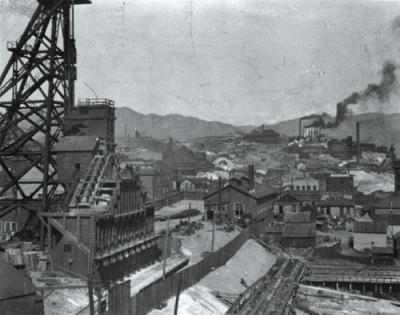 By 1890, the boisterous copper metropolis of nearly 11,000 boasted over 80 operating mines, 4,000 industrial and service workers, and some of the strongest unions in the entire country. Birdseye views depict a beehive of activity. Around the city center, at Park and Main Streets, elaborate brick buildings, two to eight stories high, symbolized the city’s power while giving shape to an impressive skyline. Above it all loomed the mighty Anaconda Hill, which author Gertrude Atherton described as a “tangled mass of smokestacks, gallows-frames, shabby grey buildings, trestles . . . looking like a giant shipwreck.”