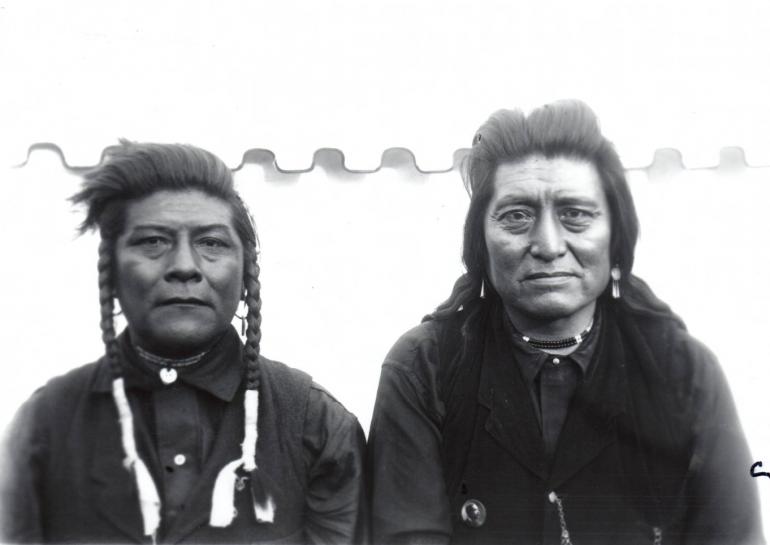 This historical portrait, in which these two Native-American men's expressive faces seem to say so much, was taken by photographer Fred E. Miller was most likely taken between 1890 and 1900.