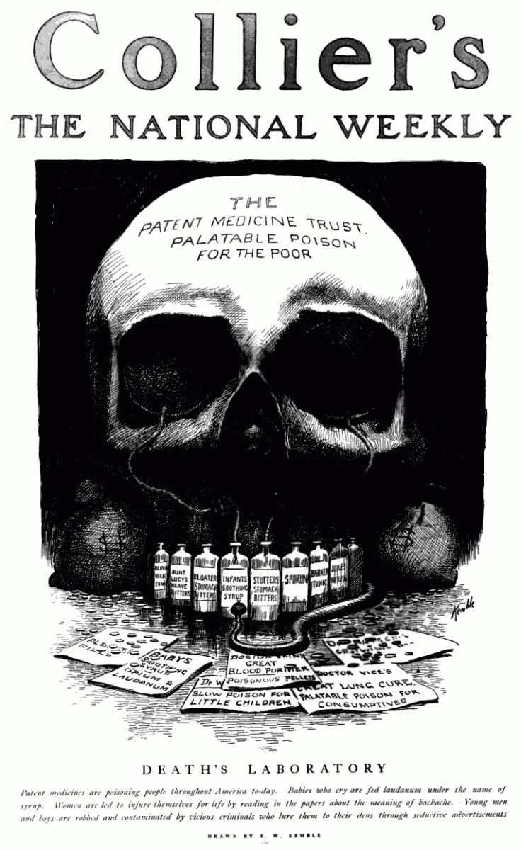 The death of snake oil was sealed by a Collier's article of 1905, which decried patent medicines as so much poison and lies. In 1906, the Pure Food and Drug Act prohibited selling one thing and labeling it as another, which was the bread and butter of the entire snake-oil industry. Soon, products had to change their names and think up new and ever-more tortured phraseology on their labels - Indian oil might replace snake oil, as surely no one would think it would contain the oil of an Indian. Many were reduced to labeling their packages with "formerly sold as rattlesnake oil," which did little to improve these dubious concoctions' reputations. They were also forced to fess up to their addictive ingredients. To this, at least, they happily complied; for some, the warning label prominently listing the narcotic ingredients became the product's most significant selling point.