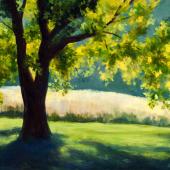 I look for the presence of back, middle and foregrounds. I simplify for 3-5 value masses, sometimes with thumbnail sketches, but sometimes in my mind. To define perspective, I locate eye level, then block in each mass in the appropriate value and color in silhouette. Sometimes, I start with middle values, sometimes darks, especially shadows. Next, I sketch in details, keeping loose, knowing that I will finalize these later. At this point, I can always stop for the session if needed. Hopefully, I have enough information to complete in the studio if necessary. Ideally, I will return again and again en locale to add layers as I develop each separate mass. Working all over the canvas, I refine big shapes into smaller shapes. Finally, the fun starts when I can add detail, either in the studio, but preferably, on location. Using this process may involve many different layers plus glazing at the end where needed, but such great fun! Consequently, I usually have 30-40 paintings in process at any point in time! Some roll over from one year to the next as I chase the seasons.
