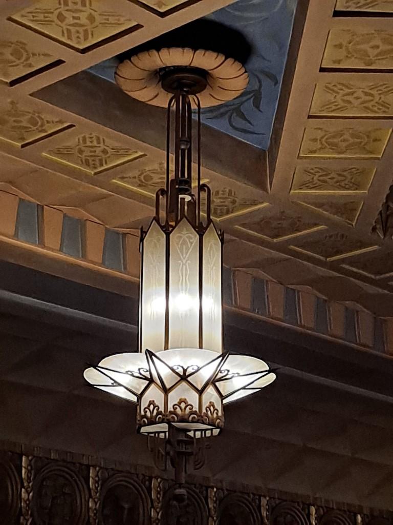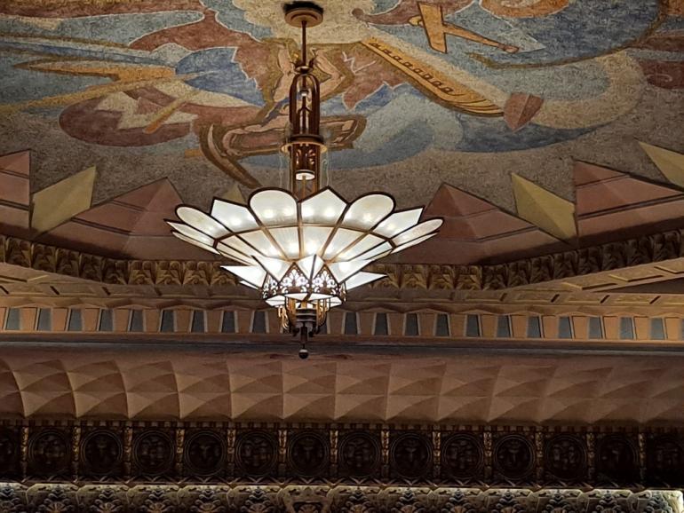 From the outside, it is a largely unassuming box, it's beautiful marquee notwithstanding. But inside, owing to the interior design of famous Hollywood designer Nat Smythe, are a series of painted murals, eight shades of gold leaf and burnished gold on the relief elements. The murals were completed by three experts working painstakingly to recreate Smythe's watercolor designs, while the other decorative elements were completed by the Painters Local of Anaconda under Smythe's supervision. This being Anaconda, there were many pieces of copper in the relief work, and carved ram's heads adorn the walls. On the roof, among dramatic deco chandeliers, is another large mural.
