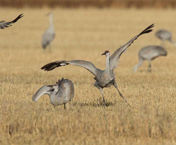 In a nearby field, hundreds more of these birds quietly pecked until some adrenaline rush lifted them from the earth in pairs or groups with a wingspan display of seven feet and legs two feet long. They hurtled upwards into the air with six-foot leaps like graceful ballerinas, yet undeniable aggression. Don’t be fooled by these long-beaked birds, who will spread their wings in defense of territorial mating and protection of their chicks. Their long beaks have been known to pierce more than just a screened window.