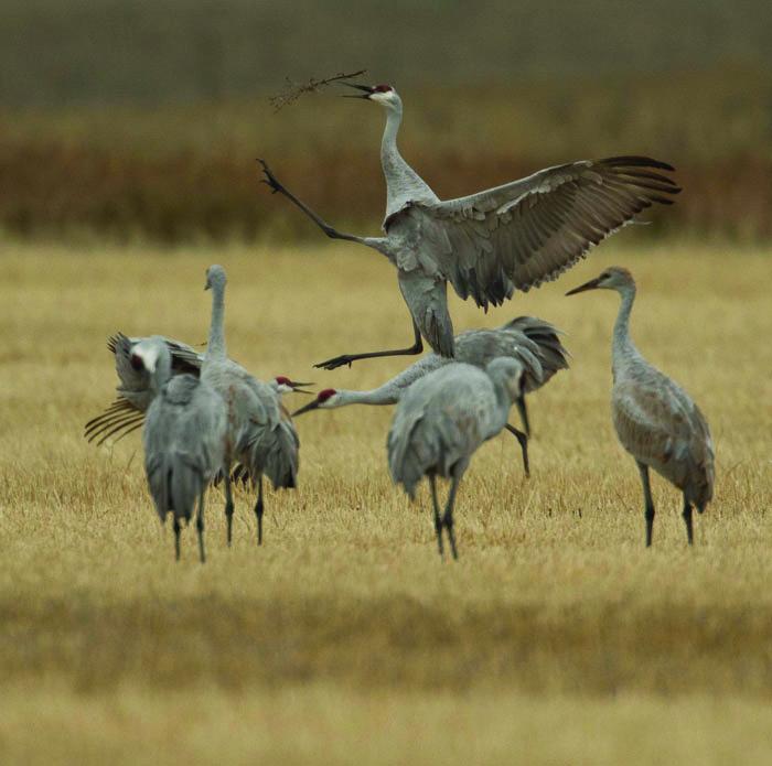 They were everywhere. A thousand tall, red-headed cranes pecking at the grain field with heads bowed. “Nothing unusual about this gathering,” I thought as a photographer scouting possible photo opportunities. But then, slight movement in the far field from the main road caught my eye. Up, up , and away, like from a trampoline rose a pair of Sandhills as if they were in their mating dance. But wait, this was late September, not the mating season, which occurs in the spring. Before migrating south, unrelated Sandhill Cranes congregate in the thousands to forage. Cranes within these survival groups can easily become anxious within the crowded fields, much like urbanized America when we require more elbow space.