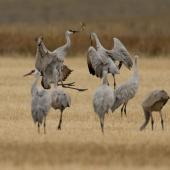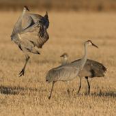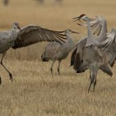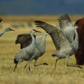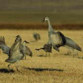 For the next three weeks in late September and early October, I drove to the stubble fields on route 87 towards Wilsall, arriving by 8 a.m. when the cranes and fields were lit by early morning, gold light. I armed myself with my giant 500mm lens and tripod. But before I approached, I took notes as to my position with the birds according to the sun. I wanted it at my backside so the crane bodies were lit and well defined against the golden wheat fields with no shadows as they started to perform. Once I established my location, I slowly walked into the open field, after the farmer’s permission, to set up on the cranes. They were unperturbed by my presence until I reached the 40-meter mark which then seemed to intrude upon their territorial field.