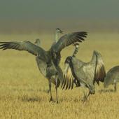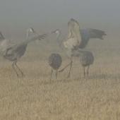 Once I started my forward progression, the flock moved towards the end of the gold grain field. Birds continued to land and take off in flight but after an hour, the edge of the field was reached and the cranes had now approached a scrubby, muted green grassy area which didn’t show off the crane colors. Next day, I would start again and hope for another surprise for my morning shoot. Fog was so thick one morning, I needed high-powered headlights. Once, I arrived, the cranes were mystical ghosts with clucks and squawks emanating from “out there.” This atmospheric scene was challenging. After 30 minutes, the fog began to lift and sun filtered through the fog which gave a soft, diffused light on my subject. This diffused light is a photographer’s dream, the opposite to harsh light in which dark shadows will appear. My background was now in a soft, misty gray while the gold fields were dulled in color. The muted grays and rust-toned feathers were still vivid. The foggy conditions did not deter their behavior. Neither did the farmer’s cattle and mingling deer who all laid claim to the stubble fields.