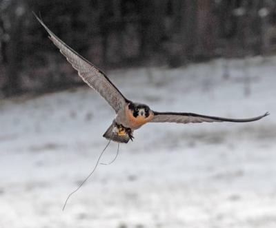 My five-year-old Peregrine Sibley has dazzled us the last few years with high stoops on ducks and pheasants and even starred in a show for Ducks Unlimited Television last year. On the second day of filming, she knocked a hen mallard into the water, which was retrieved by my friend’s English Setter, Rio. She then flew down to literally yank the bird out of Rio’s mouth with a protest and off ran the dog (for two hours). She also exhibits playful behavior in the field. On her exercise grounds, she occasionally steals hats off spectators’ heads to present to them in subsequent fly-bys. My Harris’s Hawk, Deja, has gotten adept at catching Eastern Fox Squirrels, but smacked a wild turkey last spring just for spite. I heard a thunk, and ran down the hill to find the hawk and turkey in a stare-down. Never a dull moment.