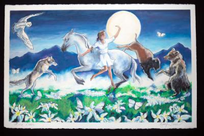 I lost Alex in 1999. I don’t know that his death really changed the evolution of my work but perhaps there is more emotion present than there once was. The imagery has become more detailed than it was 20 years ago. I sometimes portray cowgirls doing daring tricks or women in the wilds with animals around them. These images have a feeling that I think empowers women. It evokes the carefree and confident feeling that I had racing my horse across a field at the age of 15 or standing on top of a mountain at 25 or facing life as a widow.