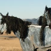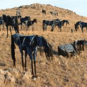 Artistry is at work here. Dolan says, “They’re not horses; they’re images of horses. If I had tried to do actual horses, it would have been a horsey project, not art.” The horses are painted blue with slashes of black or white paint, creating shadows and a three-dimensional effect. Some look thinner than others. Several foals lie down. One is nursing. The horses have manes and tails made of 4,000 feet of debraided polyester rope, which blow in the wind. Heads rest on ball bearings so they can move. Some horses graze. One poops; stones simulate droppings. Several are placed on the ridge looking at the Tobacco Roots. Others look down at the road with perked ears.