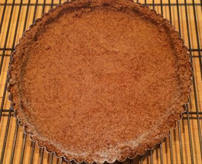 Mix the cookie crumbs, sugar, and melted butter using on and off pulses in your food processor. Press into a fluted tart pan with removable bottom and press up the sides. I use the bottom of a rounded measuring cup. Bake at 350° for about 10 minutes until the crust turns golden. Remove from the oven to a cooling rack.