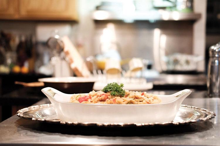 Transfer to casserole serving dish and garnish with parsley and wedges of lemon.