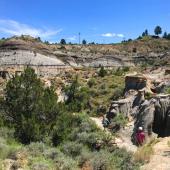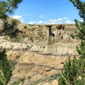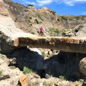 While touring the park, it is recommended to hike the Diane Gabriel Trail where you can see Hadrosaur vertebrate trace fossils projecting from the sediment, just as a paleontologist would discover them. Continue up the road to the Cap Rock Trail and experience the unique geologic formations where denser rocks sit perched atop columns that look as though they could topple with the slightest gust. Along the way, notice the KpG Boundary, and pose for a picture or two on top of the Natural Bridge.