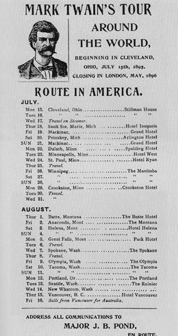 On Aug. 6, 1895, Twain left Montana. The tour would take him to the Fiji Islands, Australia, New Zealand, India, Sri Lanka, and South America. His journey lasted one year and one day.