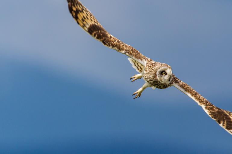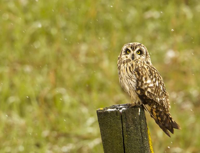 Summer is a great time to observe short-eared owls in the surrounding fields as they practice their aerial mating acrobatics. A male will plummet in flight clapping his wings on the way. Fall can bring in over 200,000 migrants. Stand at the edge of the pond and listen as the air fills with a cacophony of calls. Rough-legged hawks come through in the winter. Identify them by their light head and black slash along the eye line.