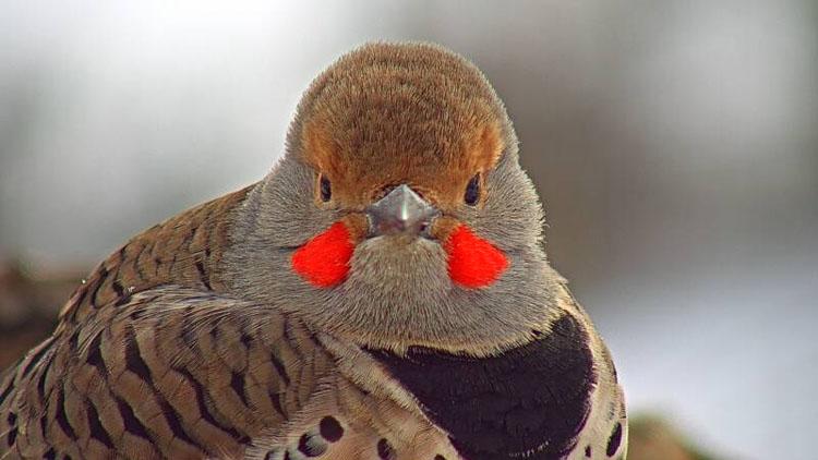 The red-topped pileated woodpecker is always a welcome arrival at the suet feeders. They often come in mating pairs. Red cheek feathers on the male make them easy to distinguish from the female partners; they often announce their coming with loud distinguishing calls as they fly in. Another handsome suet feeder, the American flicker flashes its bright orange under-feathers as it flits about. With a black bib and black spots on its chest, bright red cheek patches, and hints of orange on its wings and tail feathers, the flicker cuts a very striking figure.