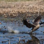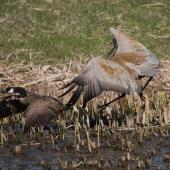 Sitting in the middle of the pond, rife with cut cattails, the exposed sandhill crane nest was constantly guarded by the alert adult cranes who took turns nesting on two eggs. A redtail hawk flew from above, scoping the scene for prey material. Canada geese maneuvered a landing on the pond. In hot pursuit, the adult crane immediately chased the geese away with tenacious running skill, giant wings flapping, and outstretched neck and beak, ready to defend her protected habitat.
