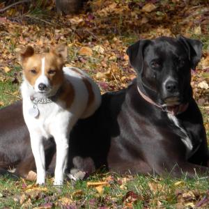 Jewel is kind to other dogs, welcoming them to Dunrovin. While unsure of this new interloper at first, she has accepted Kola and even allows him to sit on her.