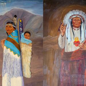 After an extensive fund-raising effort, a 3-year restoration project was begun in 2018. For the past two summers, a skilled team from Boise-based Custom Plaster, with experience in restoring historically-sensitive plaster and artwork, has been hard at work on the restoration process. They set up necessary scaffolding in the church and painstakingly re-fasten the plaster to the lath, seal its cracks and re-touch paintings with historically accurate materials. It is an intense, long, detail-oriented process, but the results speak for themselves. The murals have regained the vibrancy they had when they were first painted over 100 years ago. In addition to the murals, there is another uniquely Native religious artwork, such as portraits of Jesus and Mary as Native Americans.