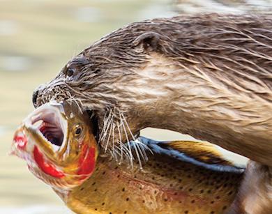 This photograph was awarded “Best of Show” in NANPA (the North American Nature Photography Association) 2015 Showcase. During the 2012 annual summer spawn of native Yellowstone Cutthroat Trout (Oncorhynchus clarkii), a female North American River Otter (Lontra canadensis) caught four Cutthroat Trout in the span of just a few minutes, delivering one to each of her three offspring. The fourth one she ate herself.
