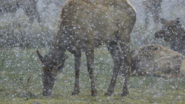 A spring blizzard and a prime subject - elk foraging on the grass – were at my disposal. My 500mm lens, resting on the beanbag on the car window, gradually filled with snow inside the lens hood. My view through the camera became obliterated.