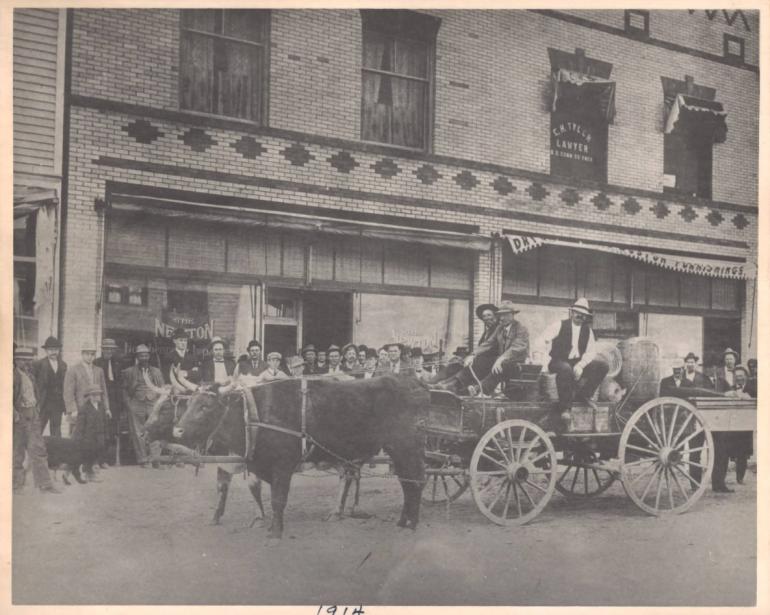 It was probably a thrill, then, when this parade was organized in Roundup in 1914. It appears to be summer, as there isn't any snow on the ground, so maybe it was a parade in honor of the fourth of July. The photo captures cart pulled by oxen as it passes in front of the storefronts of Roundup at that time, including a sign advertising the services of C.H. Tyler, Lawyer as well as a store selling dry goods and furnishings.