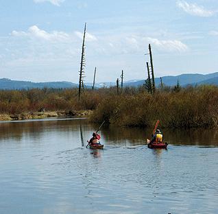I spend most of my paddling time among the ponderosa pine and lodgepole forests, west of the Continental Divide. Here, canoe trails and mild-tempered rivers, for example the Bitterroot River, are found within miles of the favorite places of whitewater pros, who brave the steep and rocky Kootenai Creek in the Bitterroot Mountains or Brennan’s Wave park in downtown Missoula. Rolling hills sideline every valley, lying at the feet of sharp, snow-laden peaks that poke through the clouds. The snow claims them most of the year, sometimes clear into August, when the dry heat of summer calls everyone to water.