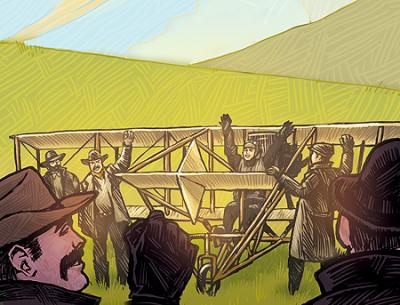 The guide fire continued to burn, the embers blasted by the wind. Cromwell tensed for the impact. Set her down, he told himself. Set her down now! The machine dropped, leveled, then dropped again. The ground raced up toward him. Three…two…. He held his breath. Three…Two…One…. He felt the bump of the wheels on the ground. They rumbled over the meadow, the machine jarring him in his seat. When he rolled to a stop, he grinned, pulled the pocket watch from his jacket, and checked the time. It was 2:34 p.m.