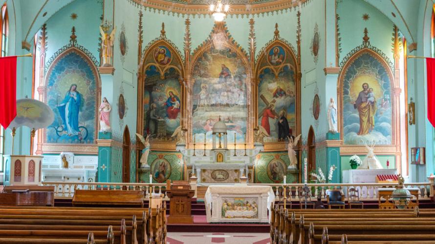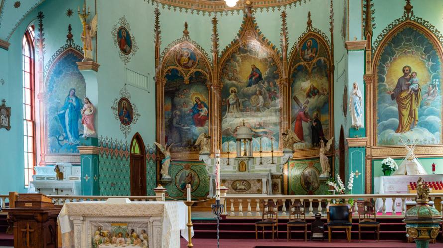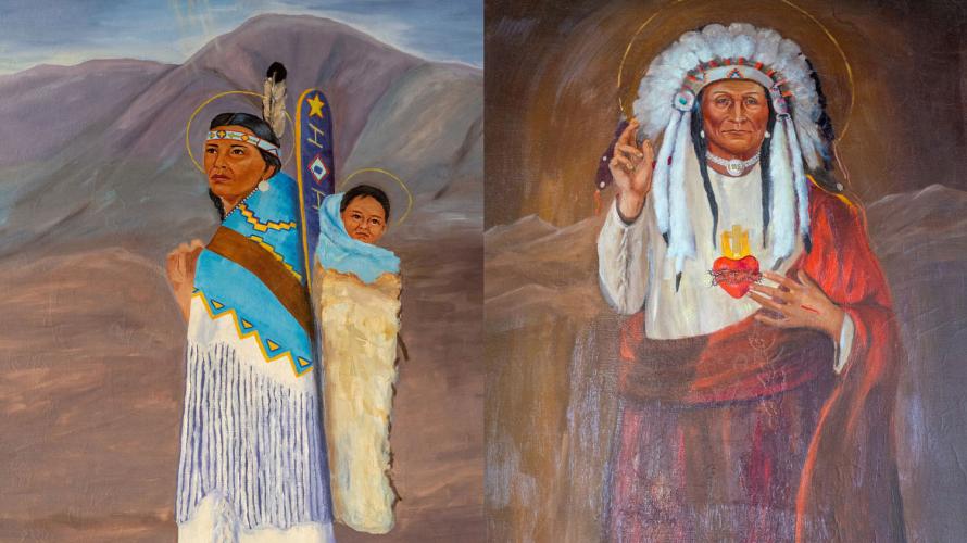 After an extensive fund-raising effort, a 3-year restoration project was begun in 2018. For the past two summers, a skilled team from Boise-based Custom Plaster, with experience in restoring historically-sensitive plaster and artwork, has been hard at work on the restoration process. They set up necessary scaffolding in the church and painstakingly re-fasten the plaster to the lath, seal its cracks and re-touch paintings with historically accurate materials. It is an intense, long, detail-oriented process, but the results speak for themselves. The murals have regained the vibrancy they had when they were first painted over 100 years ago. In addition to the murals, there is another uniquely Native religious artwork, such as portraits of Jesus and Mary as Native Americans.