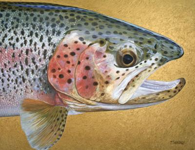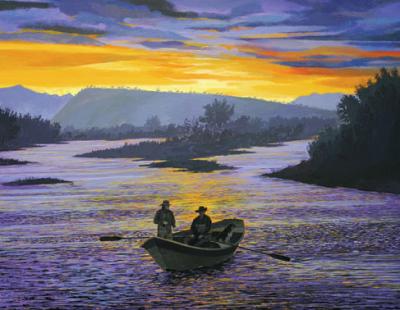 Sitting at his canvas wearing a fly-fishing shirt in the middle of the RiverStone Gallery, Bern has been a professional painter for 30 years. Experience has contributed to the perfection and detail that have become his trademark. The acrylic and oil renditions of brown, rainbow and brook trout—each with unique markings, coloring and proportions—are evidence that Bern has studied his catches closely. To truly capture these details, as his work does, requires research—also known as floating and casting a fly on the Madison River with Lexi and their “boat dog,” Plato. Lexi built an on-board “research” station that resembles an aquarium and allows them to photograph the fish that they catch.