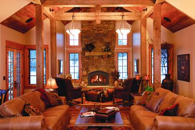So for a home with the aim of expressing the mountain beauty of Montana, she often works in varied brown tones, in textures of wood, leather, and autumn-hued upholsteries. In a room where the windows are framed in wood, with an outside view, including evergreens ascending mountain slopes, echoing that theme in furnishings and accessories makes sense.