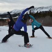 The most commonly asked question about snowga is in regards to the disparity between cold weather and flexibility. Most of us are taught that our muscles need to be warm in order to stretch, hence the deepened stretches sought in hot yoga. Jen has an answer to this valid inquiry, and it involves a 15-minute snowshoe to the location for her class, which works as a full-body warm up. Aside from being a warm-up, the snowshoe portion offers participants the ability to chat and meet like-minded community members, something not often afforded in classic indoor yoga, where excessive conversation is frowned upon.
