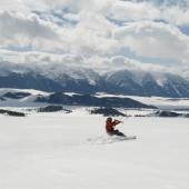 Most of one’s time snowkiting is spent cruising around on the snow. Going uphill, downhill, and across terrain features is the more meditative aspect of snowkiting. Enjoy the scenery and marvel at the wind-powered ride. However, because the kite is so very powerful, one can easily boost off the snow and immerse oneself in intense sessions of pure aerial freestyle. Front rolls, back rolls, sky-high boosts, and long floaty glides quickly become part of a kiter’s adrenaline-filled airborne repertoire. Snowkiting imports skills from many sports and synergizes them into a new realm of personal wonder and amazement.
