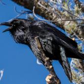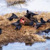 They will cache meat, often at long distances if there has been a crowd of them feeding. Their memory of locations lasts up to two weeks — not as long as a Clark’s Nutcracker, but then ravens’ food will spoil if left much longer. They devise elaborate strategies for hiding their own caches of meat from other ravens, even pretending to leave food if they are being observed, in anticipation of likely thievery. Bernd Heinrich, a prominent raven researcher, has shown that adolescent ravens will communicate the distant presence of food to other ravens, such as at a communal roost. This is called “displacement,” a phenomenon seen otherwise only in humans, ants, and bees. Perhaps this recruitment of others reduces fear and increases access to food.