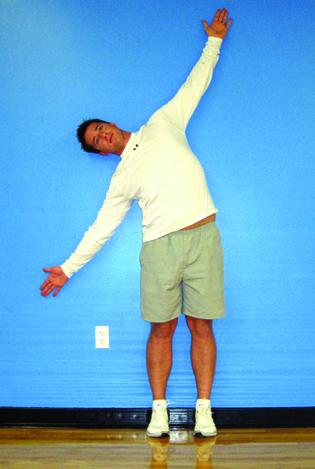 Standing windmill:Stand against wall. Lean to each side, keeping in contact with the wall.