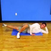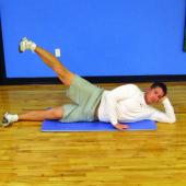 Side lying abduction/adduction: Lie on one side first, making body long and straight. Lift top leg 20 times. Then put top leg foot in front of knee and lift the bottom leg 20 times.